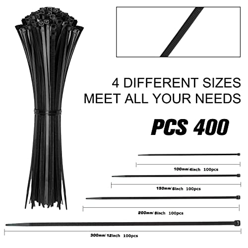 Details: This pack of cable ties comes with assorted sizes cable ties for a wide range of personal and professional needs.Each size cable tie has a wide range of uses,suit for multiple purpose projects in different situations. Zip tie is a type of fastener for holding items together Great for indoor or outdoor use. Made of durable and weather resistant material make sure it outdoor use in direct sunlight is not an issue.The design is reasonable, simple operation.Get such a great tool and get rid of messy cables!Often Used for Organizing Electrical Wires & Cords, Securing Loose Objects, Cable Management, and Other DIY Projects! Specification Color:Black Material:Nylon Directions for use:perforate and pull Features:Self-Locking,pull more tight ,soft,easy to opration Package include 100pcs x 4inch cable ties ,dimensions (W x L):2.5X100mm Loop tensile strength:18lbs 100pcs x 6inch cable ties, dimensions (W x L):2.5X150mm Loop tensile strength:18lbs 100pcs x 8inch cable ties,dimensions (W x L):2.8X200mm Loop tensile strength: 22lbs 100pcs x 12inch cable ties,dimensions (W x L):4.8X300mm Loop tensile strength: 48.5lbs Note 1. Please kindly note that cable ties should be kept out of reach of children. 2. Please kindly cut cable ties with scissors or knifes instead of pulling them with hands. 3. Please kindly note that cable ties should be used in proper temperature and tension.