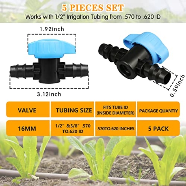 - FITS 1/2 INCH DRIP IRRIGATION TUBING:These 1/2 drip line valve is compatible with most of 1/2 drip irrigation tubing. It can regulate and turn on/off water flow, help you save water effectively.