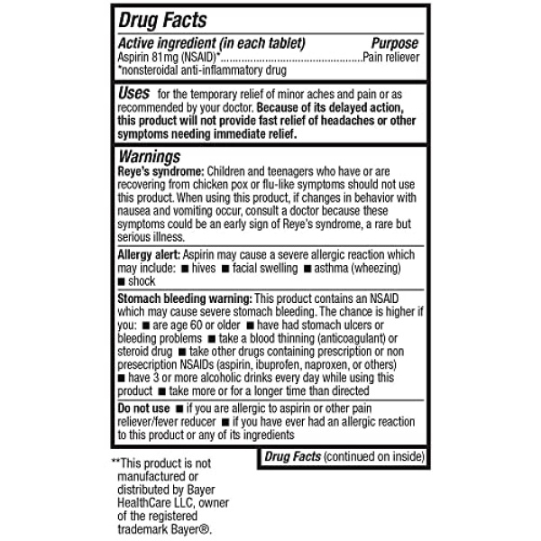 • Relieves Minor Aches and Pain: Low dose aspirin relieves minor to moderate pain and inflammation. It is a non-steroidal anti-inflammatory which can effectively reduce inflammation and its painful symptoms.