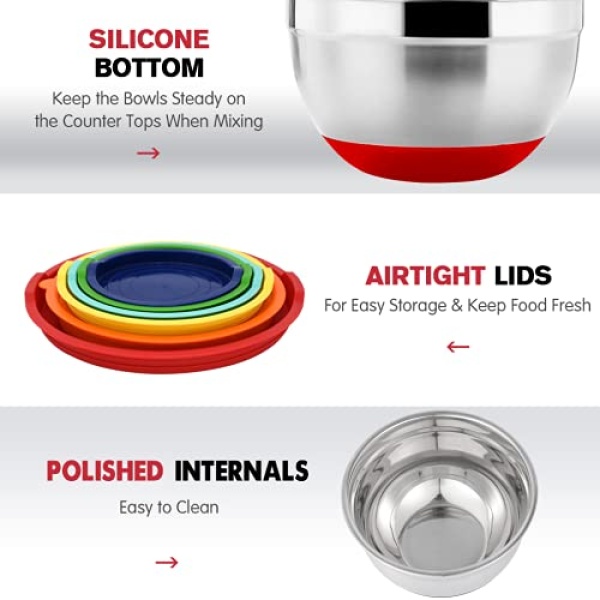• 🍜[ NON SLIP BOTTOMS] Flat silicone grip portion on the bottom would prevent the metal bowls slippage when mixing, beating and whipping! Also protect the desk from high temperature.