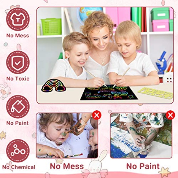 - 🍎🍬Easy Carried & Educational Toys: 🎁The rainbow scratch pad can enhance children’s drawing ability and stimulate their imagination. Art sets contains some stencils helps children to inspire the inspiration and creativity. Educational Toys for girls to create art project; What’s more, the size of art craft paper is small, great at home or travel with carrying box